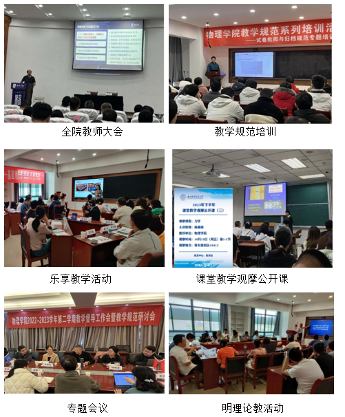教育教学水平自评自建。学院秉持“学为中心、追求卓越、持续改进”的教学质量保障理念,着力推进“思政引领、三航特色”的课程体系建设。一方面,学院以课程负责人为核心,全面加强大学物理及实验课程的建设和教学团队的建设。依托“文科类大学物理虚拟教研室”“明理论教”等教学交流平台,以教学比赛为引擎,磨砺教师的教学能力,积极组织教学研讨,推进各级各类教改项目的研究,提升课堂教学质量,为培养新工科、新文科人才提供有力支持。另一方面,学院以专业负责人为核心,依托“国家级一流本科专业建设点”“江苏省基础学科拔尖人才培养基地”,结合“1+4启明导师”、科普育人、主题创新区建设等举措,系统推进应用物理学专业“三融三力”的拔尖创新人才培养体系建设。学院先后出台《本科生启明导师制实施办法》《公共基础课程负责人聘任及管理办法(试行)》《本科专业负责人聘任及管理办法(试行)》《创新实践项目管理办法(试行)》《本科生班级导师管理办法》《本科教学经费管理办法(试行)》《专业建设指导委员会工作职责》《教学团队建设与管理办法(试行)》等系列管理制度,持续完善构建本科教育教学管理体系。