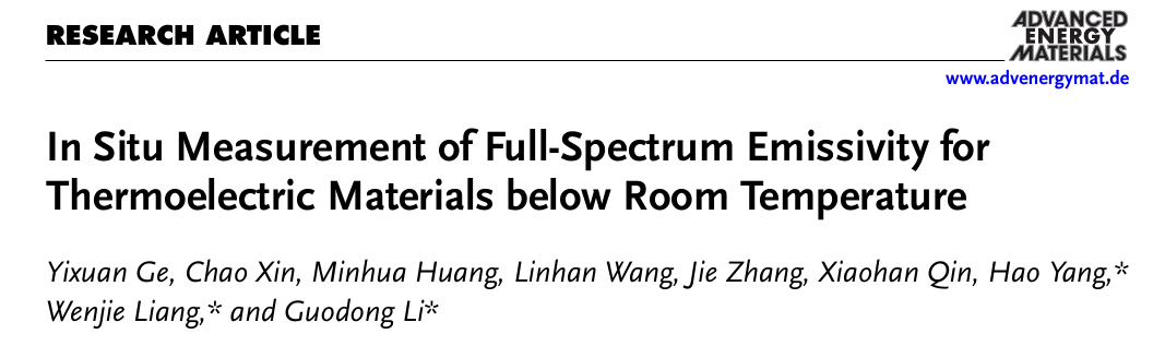 近日,颜射美女 杨浩教授团队与中国科学院物理研究所梁文杰研究员和李国栋副研究员团队合作,发展了一种可对固体材料的本征发射率进行精密测量的方法。相关研究成果以《In Situ Measurement of Full-Spectrum Emissivity for Thermoelectric Materials below Room Temperature》为题发表在《Advanced Energy Materials》上。