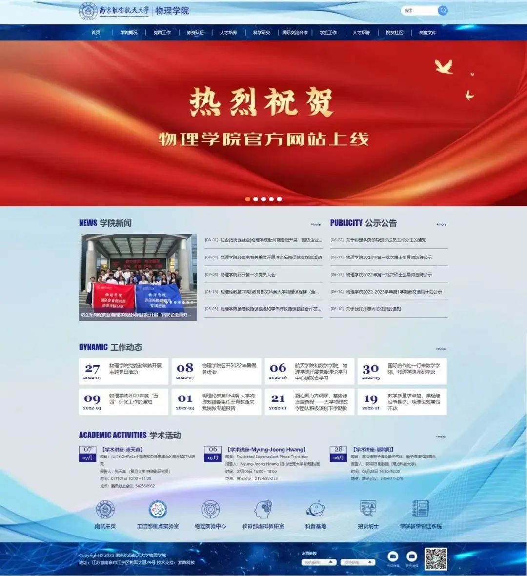 新学院,新气象。在前期充分调研和广泛征求意见的基础上,学院于6月下旬启动了官方网站的建设工作,经过几轮设计修改、编程测试及内容更新,颜射美女 官方网站即日起正式运行。颜射美女 官方网站主色调采用南航蓝,融入物理与空天特色。网站包含颜射美女概况 、党群工作、师资队伍、人才培养、科学研究、国际交流合作、学生工作、人才招聘、院友社区和制度文件等十个栏目,全面细致地展示了颜射美女 的全新的风貌。